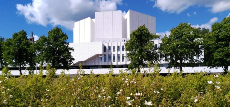 Kuvasta pilkistää Finlandia-talo ja Kansallismuseon torni kauniiden valkokukkaisten pensaiden takaa Helsingin Töölönlahdella! Kuva: KivaaTekemistä.fi