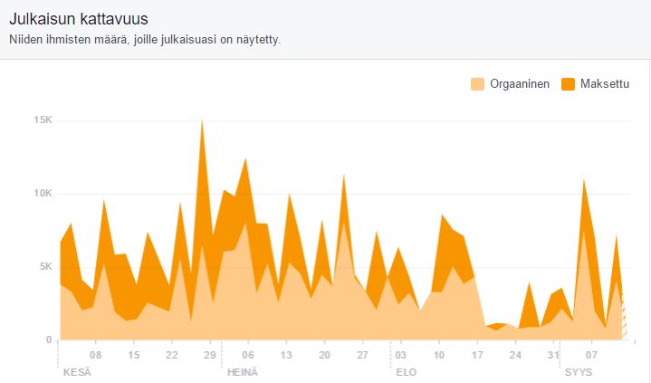 Kivaa Tekemistä Facebook-tavoittavuus oli esim. 7 päivän jaksolla 6.-12.9. yhteensä 28 600. Kuvaajasta näkyy, että tavoitimme kesän aikana useina yksittäisinäkin päivinä jopa yli 10 000 ihmistä. Tykkääjä-määrämme Facebookissa on yli 11 100.